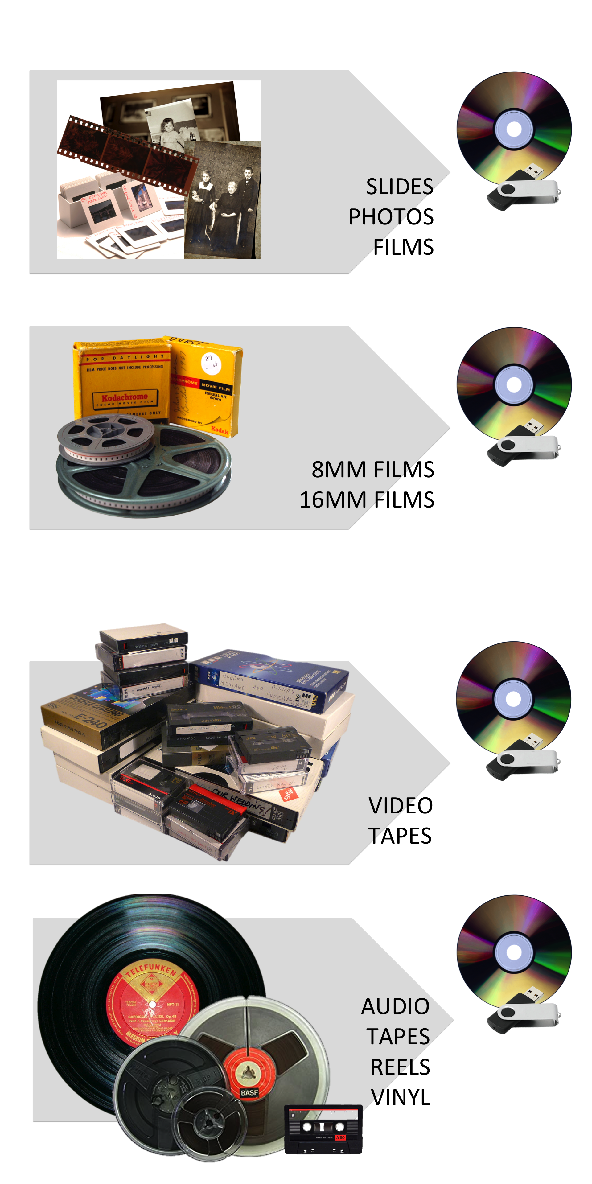 Various types of video and audio conversion, anything from 8mm or 16mm film and VHS to DVD to digital to flash drive, as well as Hi-8, minidv, VHSC, beta, and more, all to digital, DVD, or flash drive.